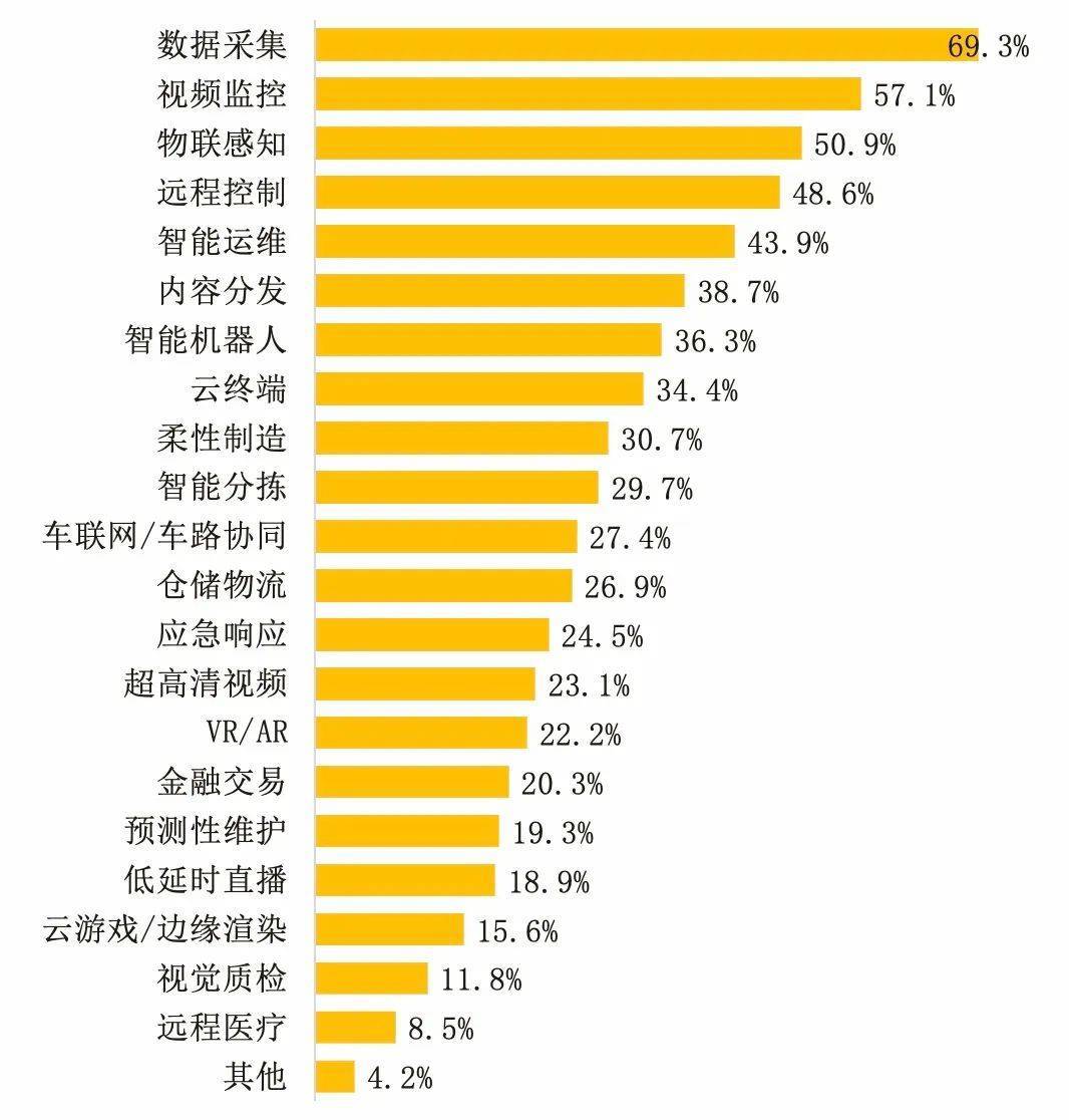 而远程医疗、视觉质检、云游戏、边缘渲染、低延时直播等场景应用在受访企业中占比不足20%,未来,仍有更多创新落地的空间。