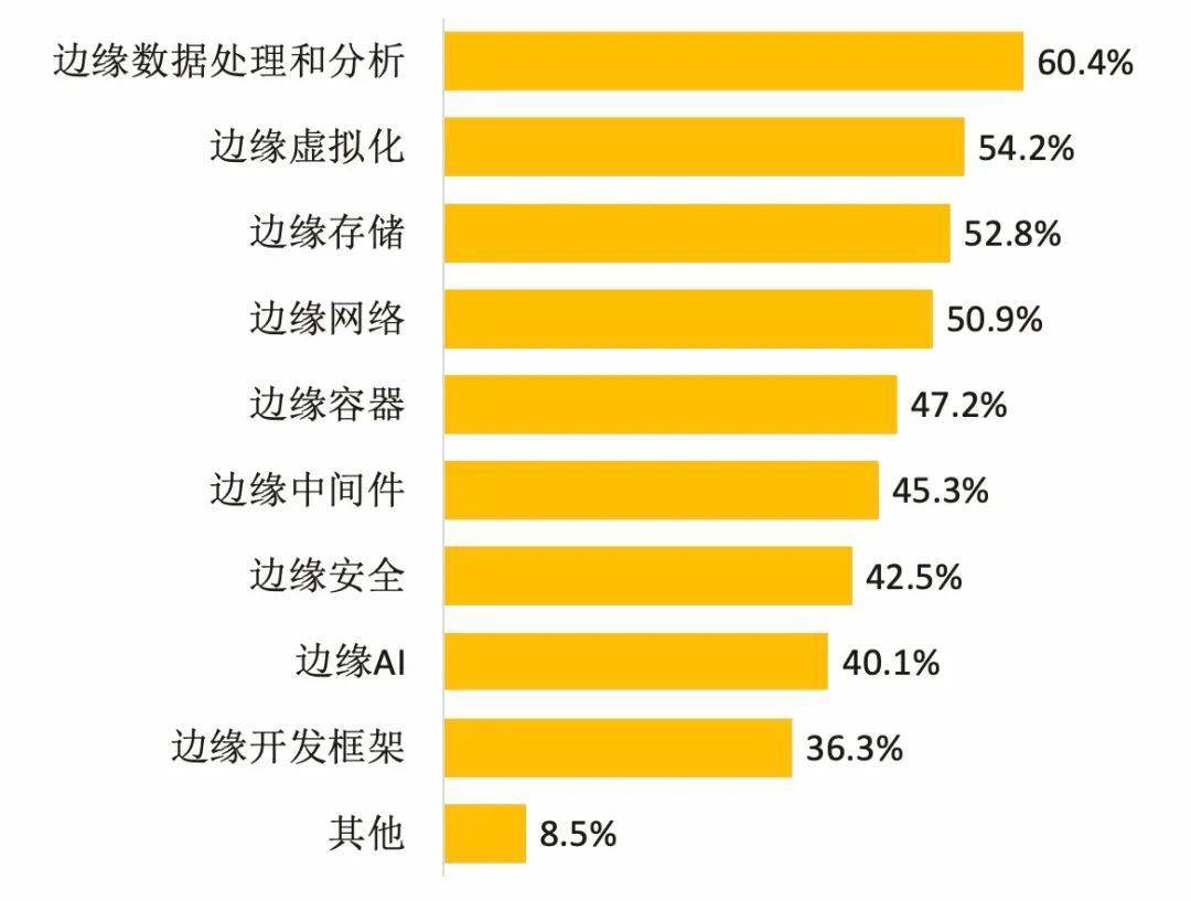 | 在技术应用方面,受访者企业中,边缘数据处理和分析、边缘虚拟化、边缘存储和边缘网络等技术应用较为广泛,占比均超过50%,同时,开发框架、AI、安全、中间价和容器等技术,在边缘的应用仍待进一步发展。