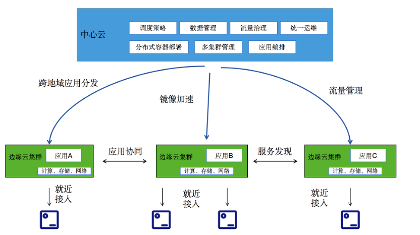 | 服务流量治理:通过云边、边边容器网络互通,服务智能路由(位置、时延、网络质量等),流量管理(流量切换、限流、降级、负载均衡等),实现服务统一治理。