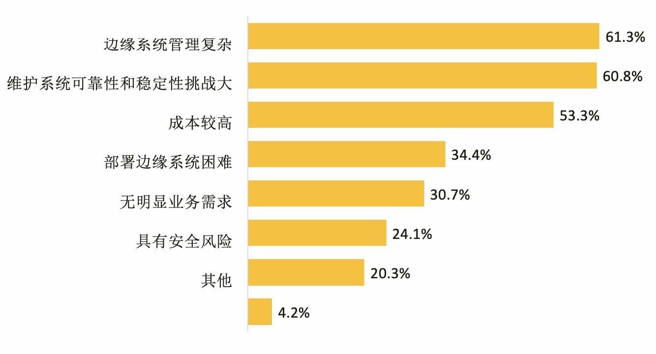 | 在部署挑战方面,边缘系统管理复杂、维护系统可靠性和稳定性、成本等因素成为边缘云部署的主要挑战,在受访企业中占比分别为61.3%、60.8%和53.3%。
