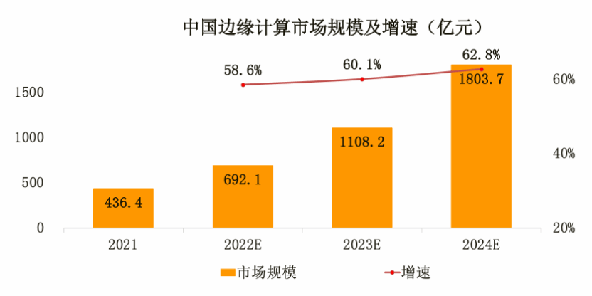 2021年,我国边缘计算市场规模达到436.4亿元人民币,预计未来三年年均增速超过50%,至2024年边缘计算市场整体规模达1803.7亿元,边缘计算市场增长空间广阔。