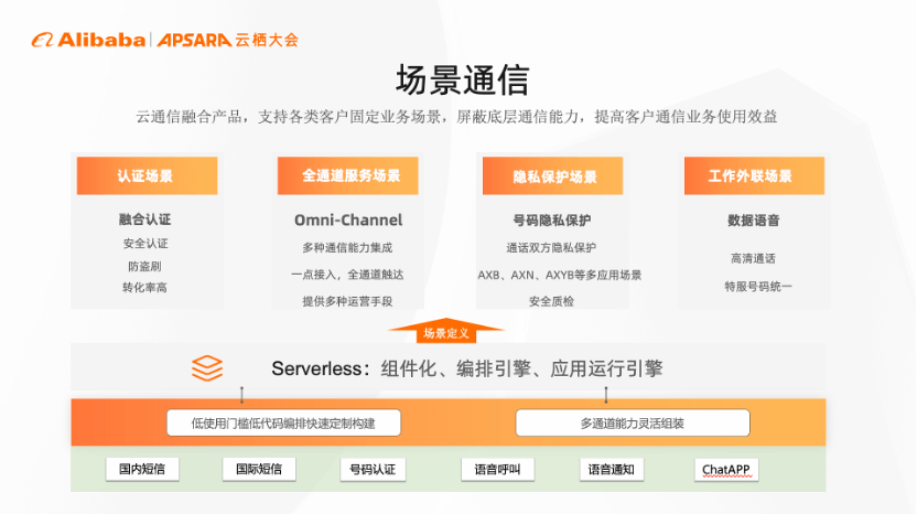 阿里云云通信采用云原生化的方式,通过低代码、组件化以及可视化编排,为客户提供安全可信、场景化、智能化的定制服务。