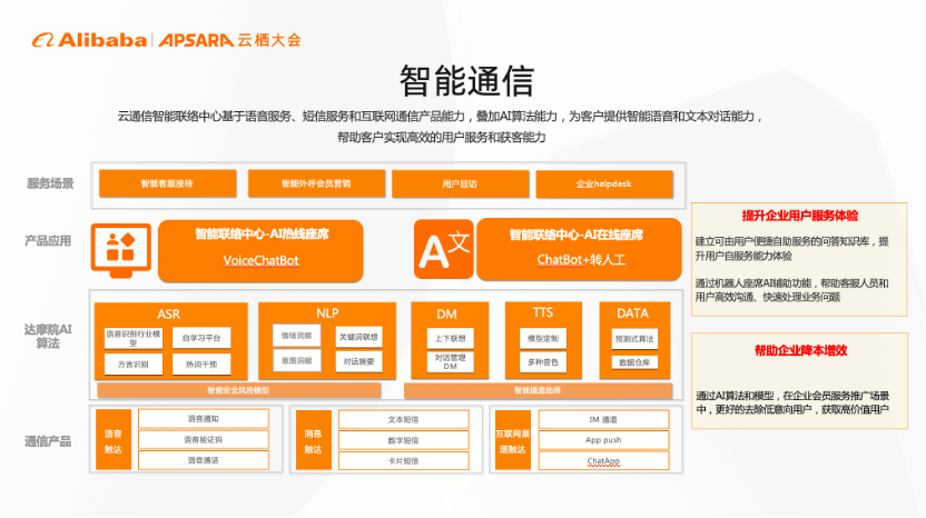 基于底层语音消息等通信产品,叠加达摩院AI算法能力,云通信向外输出AI热线座席(VoiceChatBot)和AI在线座席(ChatBot+转人工)两类产品,为客户提供智能语音和文本对话能力,帮助客户实现高效的用户服务和获客能力。