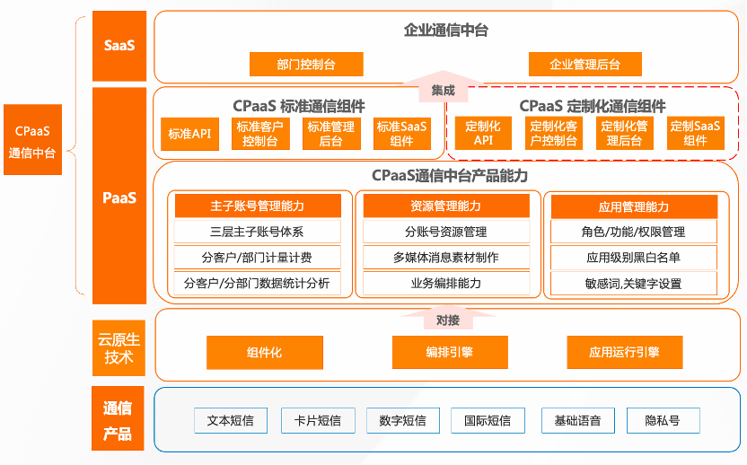 在PaaS层,CPaaS通信平台为企业提供主子账号管理能力、资源管理能力和应用管理能力,通过低代码的方式,支持客户个性化管理账号、黑白名单等,自定义设置业务的重发和转发机制,满足客户动态化的业务需求。