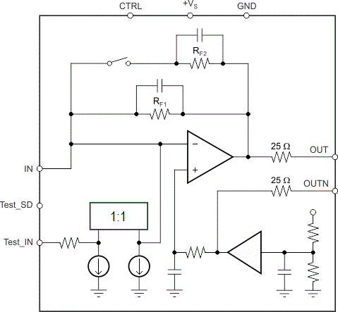 A 25Ω series resistance is also found on each output, limiting the loading the amplifier experiences, but also reduces the gain. With a 500Ω differential load, the attenuation due to the load is 0.83dB, which impacts the overall transimpedance gain. Due to the load attenuation, the 20kΩ transimpedance gain is reduced to an effective 18.2kΩ while the 5kΩ is reduced to an effective 4.5kΩ.