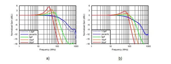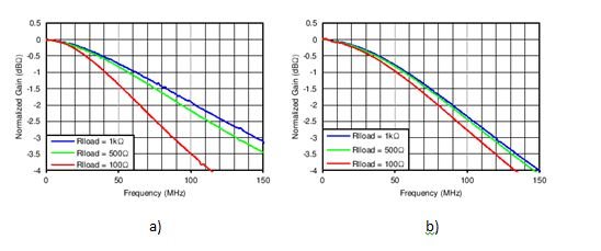 Figure 3: OPA857 bandwidth variation with load, a) 20kΩ, b) 5kΩ