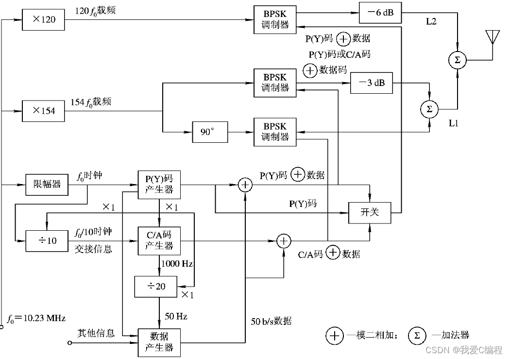 最早的GPS包含L1和L2两个频段,其中L1上调制CA码,P码以及导航电文,L2上调制P码和导航电文。在实际接收到的GPS信号中,我们除了能够接受到CA码和P码外,还能检测到L1和L2两种载波信号。GPS双频发送器的基本构架如下所示: