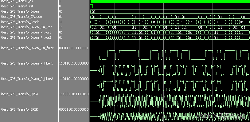 一般情况下,导航电文的频率为50hz,CA码的频率为1M,P码的频率为10M。这里,为了测试的需要,我们需要降低频率来进行测试。整个发送端,按如下的结构设计: