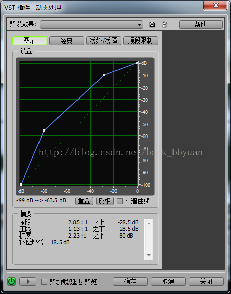 如果从实际使用角度出发,所以我觉得一个合适的DRC三段就可以了,不能太复杂,用于语音信号的典型的一个DRC如下: