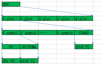 symbol即上行符号,1symbol=CP+SC-FDMA与下行不同的是,每个slot除了7个symbol外,还有1段保护间隔GUARD。其中GUARD长度为2304 TS。