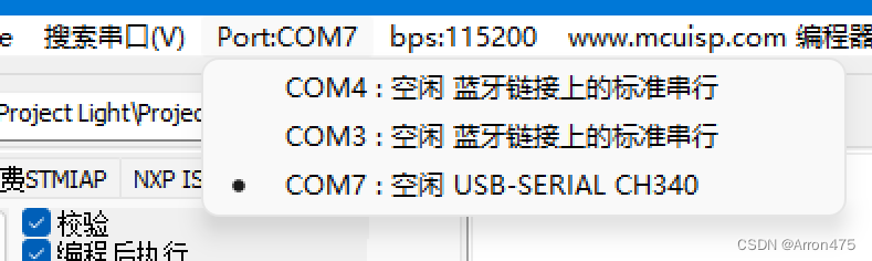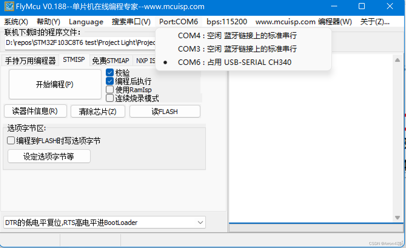(5)、打开FlyMCU,确保刚才端口是空闲状态(一般来讲,设备管理器识别的COM口号和FlyMCU的COM口号是一致的。这里解释一下为什么这里的COM口号和上面不同,因为笔者没有当时的截图,下面这张图时后来写博客时补的图...原来的端口电脑经常识别有误,所以插了另一个端口。)
