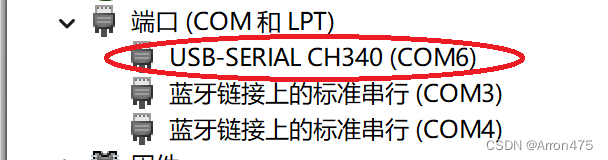 (4)、打开设备管理器,确保有USB-SERIAL CH340(COMx)(如果没有显示或显示未知设备就去安装一个CH340的驱动)
