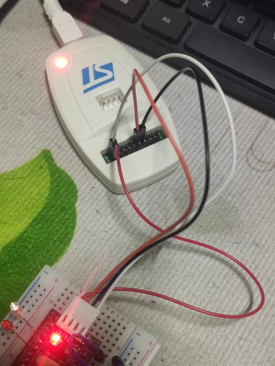 注意,下图此处有小红灯亮了,说明RXD连接PA9引脚连接可以导上电;如果是不亮的,则要检查一下是否会导电。