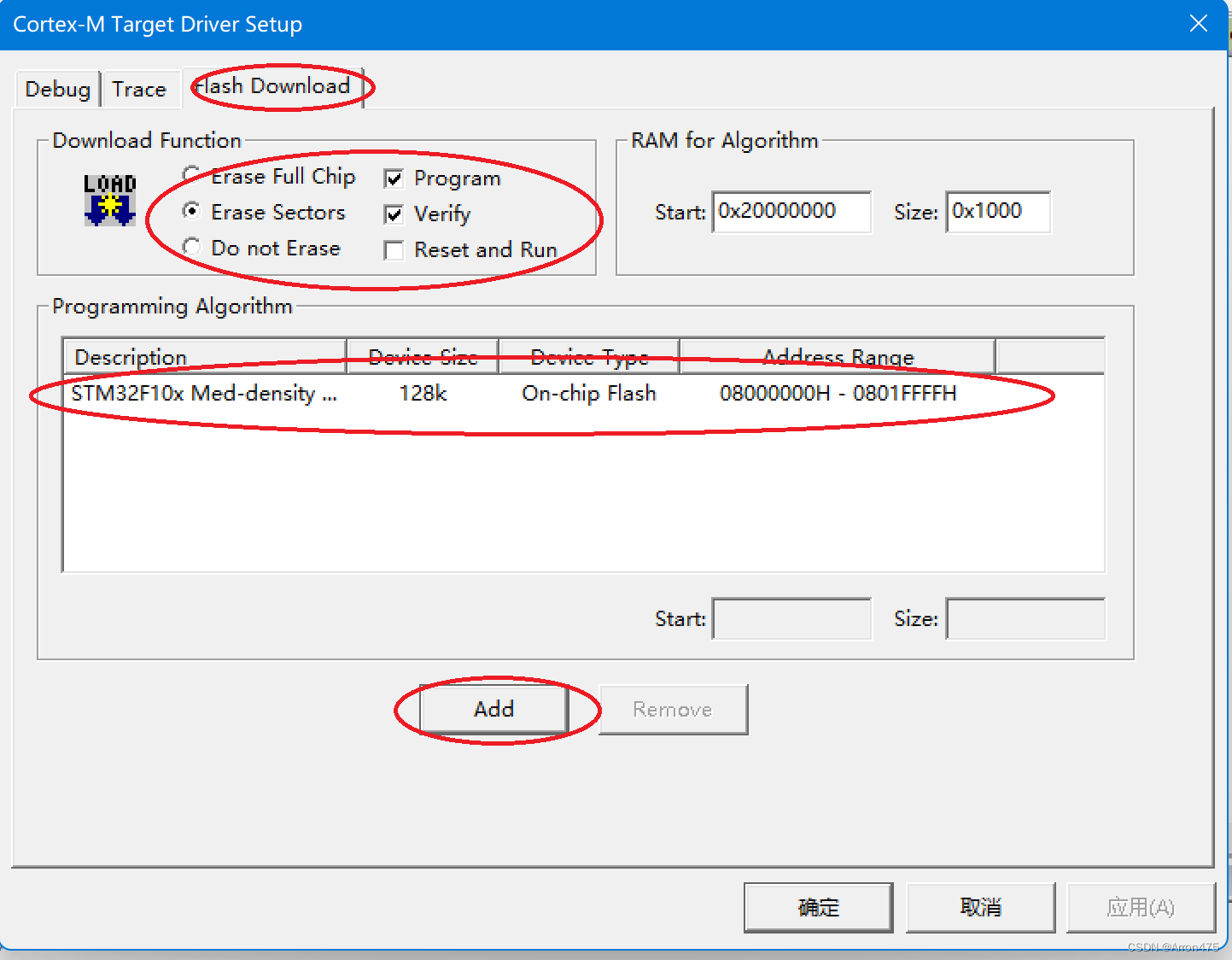 点击上图蓝色框里的Setting,选择Flash Download,进行以下配置。(如果不选Reset and Run则每次烧录到板上后都需要按一下板上的Reset按键才会看到现象。选不选看个人,影响不大)