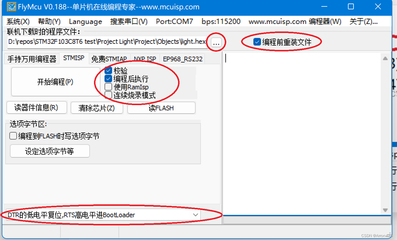 (6)、进行以下配置,并点击三个小点...处,选择工程编译生成的.hex文件,点击开始编程。