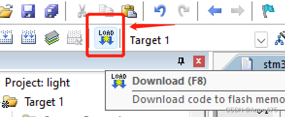 (5)、打开Keil,在确认编译过、0错误,0警告后点击LOAD下载按钮。