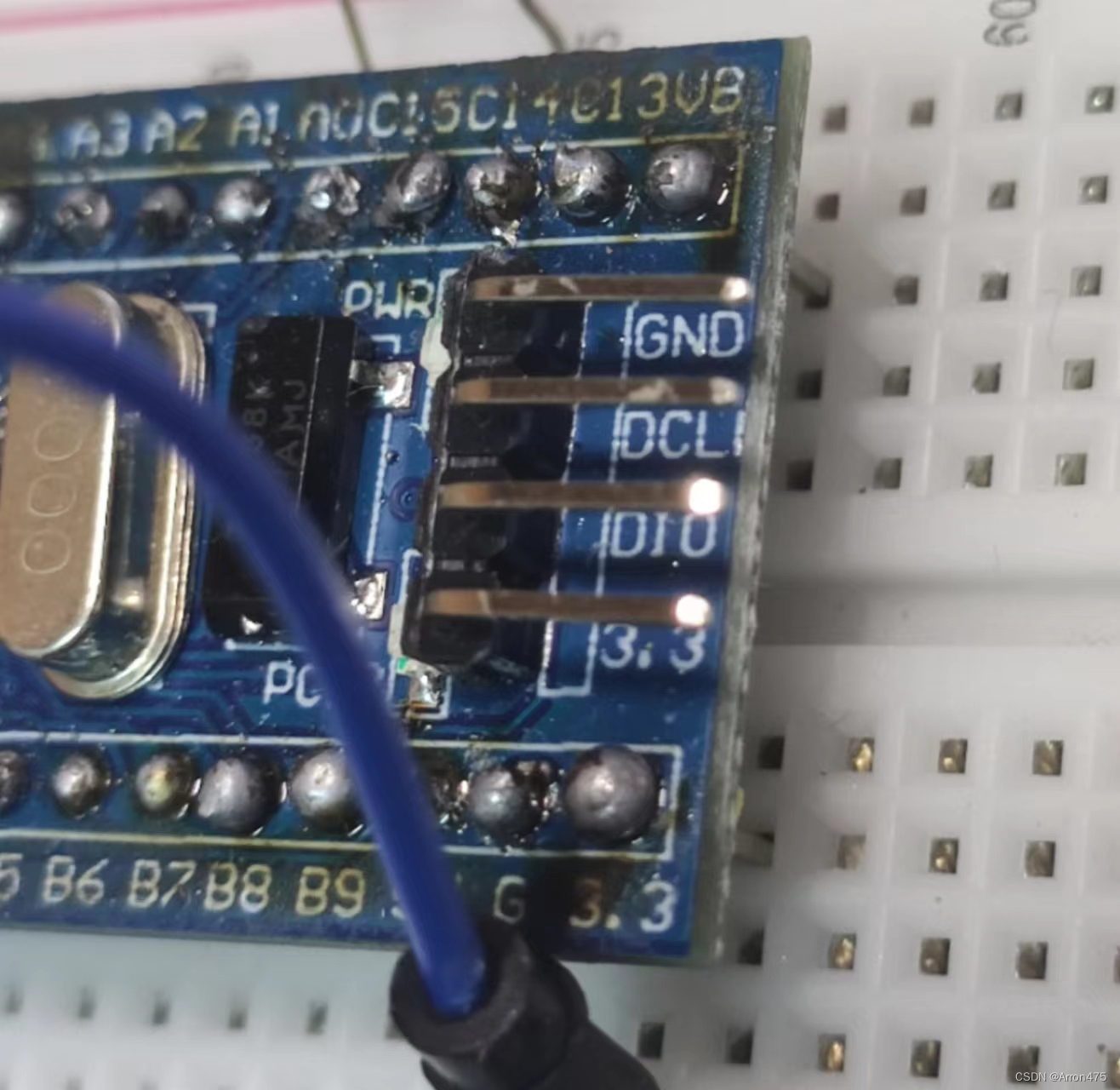 (1)、将STM32F103C8T6插入面包板,注意!一定要插深一点!确保C8T6的引脚能和面包板进行导电!!(笔者因为这个小细节没注意,排查了好几天的代码、硬件,甚至以为是笔者焊接不到位,重新把板的引脚焊过...最后排查出来是面包板和开发板的引脚接触不紧密没导上电...血的眼泪...)