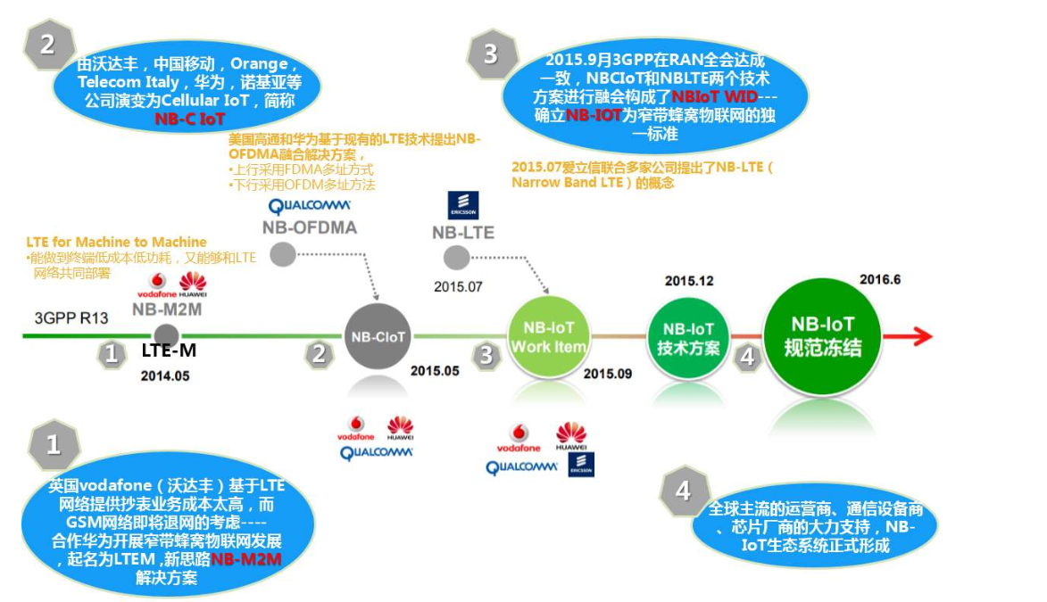 来回顾一下NB-IoT的发展历程:2013年,业内相关厂商、运营商展开窄带蜂窝物联网发展,起名为LTE-M;2014年由沃达丰、中国移动、Orange、意大利电信、华为、诺基亚等公司支持的LTE-M在3GPP GERAN工作组立项,被重新命名为Cellular IoT;2015年,华为和高通共同宣布了NB-CIoT方案;同年8月,爱立信联合几家公司提出了NB-LTE概念;2015年9月,NB-CIoT和NB-LTE两个技术方案进行融合,NB-IoT正式诞生。