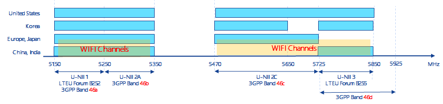 所以可以看出,这两种体系,定义5GHz的非授权频谱的方式,并不是一一对应的。