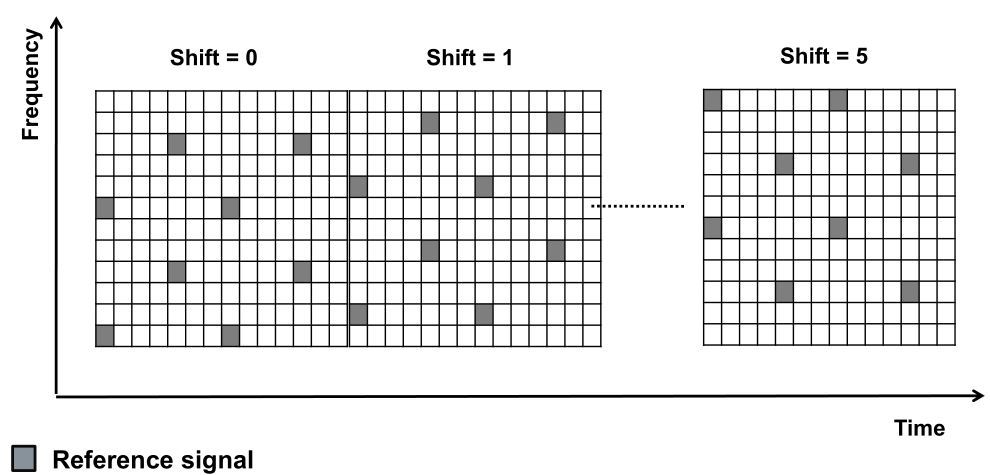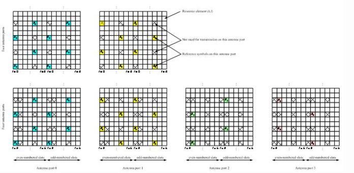 时域上每隔三个符号位一个,具体的位置排列跟CELLID有关,天线端口等于1时的参考信号位置: