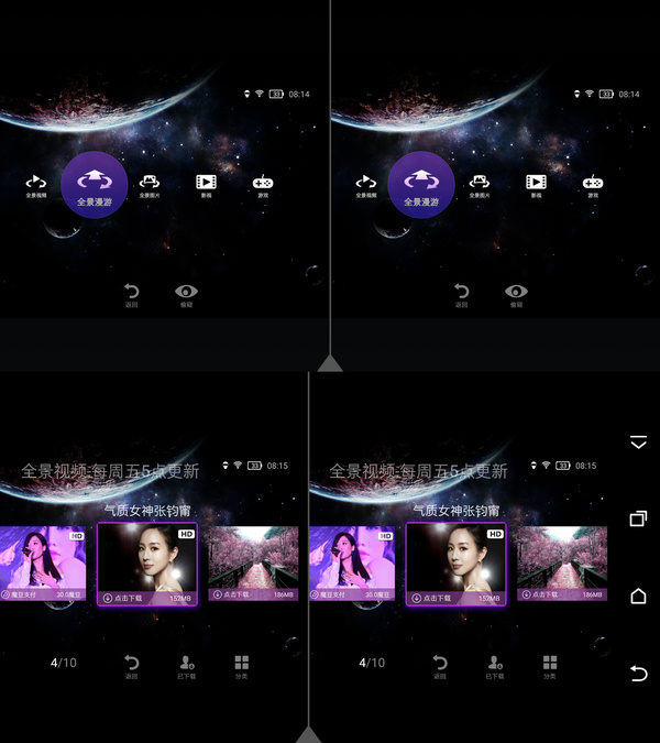 虚拟现实设备最重要的就是亲身体验,笔者在这里也只能是大概描述下使用的具体感受。调节好观看各项参数后,从魔镜中看到的视野呈现为曲面,左右晃动头部即可获取不同的内容,这种效果在全景资源中的感受尤为突出。以现场热舞为例,整个人的位置就是漂浮在舞台中央,上下左右晃动可以得到360度的全场图像,完全由自己掌握,观看高清晰度的全景图片效果更佳。