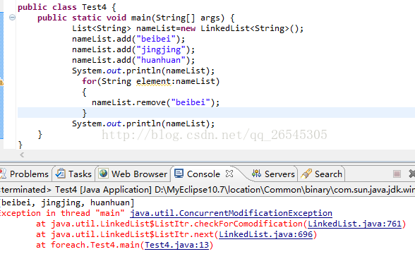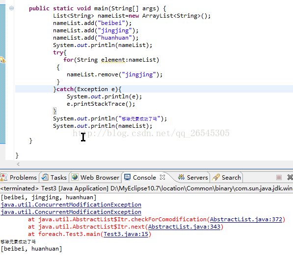 由输出结果可知,foreach循环抛出ConcurrenModificationException异常。