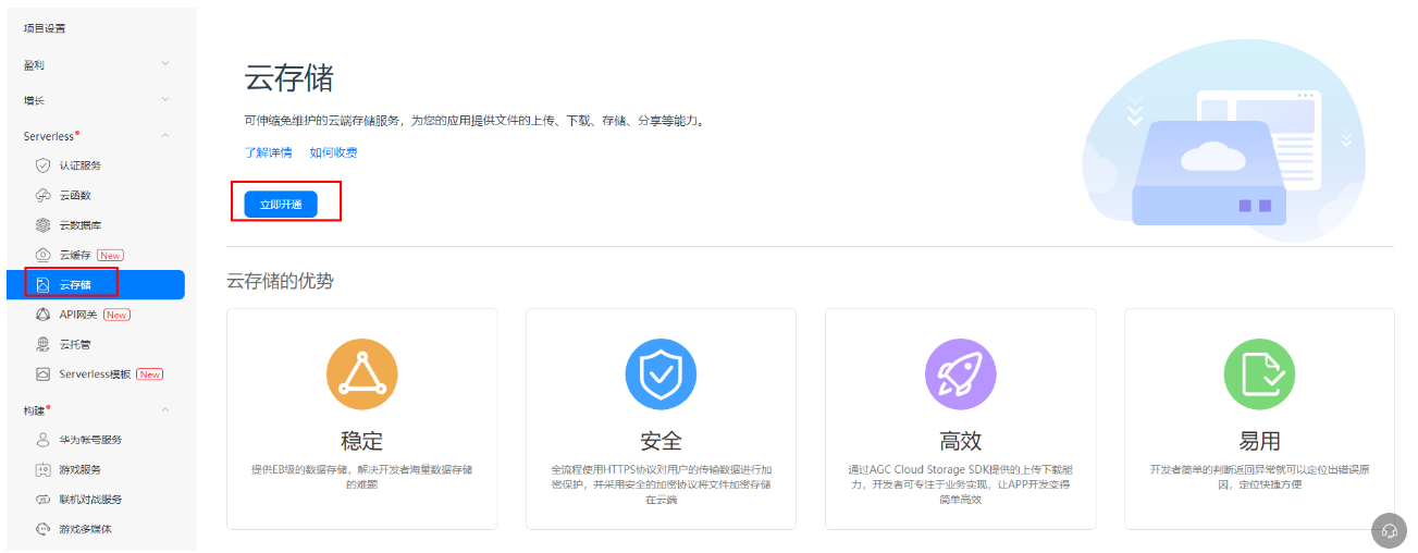 3)在左侧导航栏中,选择“Serverless > 云存储”,在“云存储”页面,单击“立即开通”。