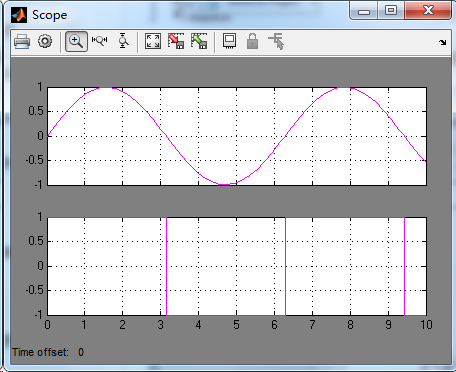 如图所示,很明显此时的正弦波已经变成了方波,这是switch功能实现的,在这里我们设置1和-1作为两个判定点,大于0时,输出为1,反之输出为-1,就形成了标准的方波信号,此外,判定点的值可以自行设定,也就是控制方波的上下幅值。
