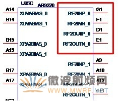 这里必须指出的是,Atheros的收发器一般会同时对输入与输出做差分处理。但是Ralink一般要求外部输入的信号是差分的,而自身输出的射频信号则不是差分的。图2-3和图2-4分别给出了RT3052(Ralink)和AR9220(Atheros)的主要射频信号管脚。不难发现,Atheros的设计相比Ralink要更加细腻,不只是收发器芯片,在后续电路的设计中,也会发现,Atheros考虑的问题很周全,我想,这也是我们作为研发人应该具备的一种精神。