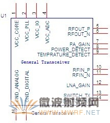收发器通常会有很多的管脚,在如图2-1中,我只给出了射频电路设计时会关注的管脚,可以看到,有几个电源管脚,数字地,模拟地,射频输出,功率放大器增益控制,功率检测,温度检测,射频输入,低噪声放大器增益控制,发射、接收切换等管脚,在接下来的内容中,我会把这些管脚分模块逐个讲解。