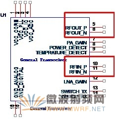 对于射频信号,为了增强收发器的抗干扰能力,一般会采用差分信号的处理方式,也就是说,收发器会以差分形式将信号发送出去,同时外部电路也必须为收发器提供差分射频信号的输入。如图2-2所示,红色方框内的四只管脚就是这个收发器的差分射频信号的输入,输出管脚,也是最重要的射频信号管脚。