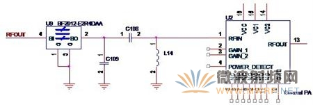 以上我们讨论了功放电路的输入回路的两个组成部分,带通滤波器和Π型匹配网络,有了这两个部分,我们就可以设计一个完整的输入回路了。如图3-6所示,就是一个设计完整的功放电路输入回路。图中的U9就是一款成品的带通滤波器,而C108,C109和L14就组成了一个Π型匹配网络。