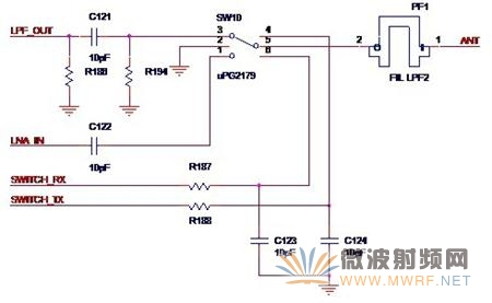 如图5-3所示,就是Atheros的典型发射与接收回路SW10就是那颗切换芯片。LPF_OUT是来自功率放大器的输出信号,R186,C121与R194组成了Π型匹配网络,LNA_IN是送至低噪声放大器的信号,SWITCH_TX与SWICTH_RX这两个信号的组合就控制着是打开发射通路还是打开接收通路。