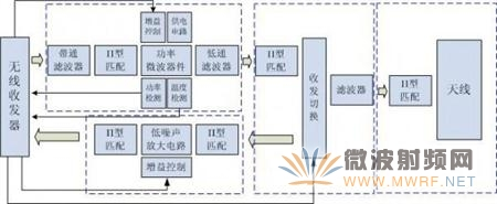 通过前面的讨论,我们已经知道,功率放大器是由带通滤波器,Π型匹配网络,功率微波器件,增益控制,供电电路,功率检测,温度检测低通滤波器这些部分组成的;低噪声放大器是由Π型匹配网络,低噪声放大电路和增益控制组成的;收发切换器是由Π型匹配网络,切换芯片,滤波器组成的;天线和连线连接器部分是由Π型匹配网络和连接器组成的。于是,我们得到了Wi-Fi产品一般射频电路的详细框图,如图7-2所示。