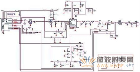 想必大家应该比较清楚那三部分的结构了,好,让我们来试一下,在图2-2那个芯片的外围放置一些器件,再连上几条线,完成无线收发器及其外围电路设计。在这里,我们对收发器输出的差分信号用平衡器处理得到单端信号RFOUT,来自低噪声放大器的接收信号RFIN用分立元件处理得到差分信号RFIN_P,RFIN_N。这样,就得到了如图2-11所示的原理图。