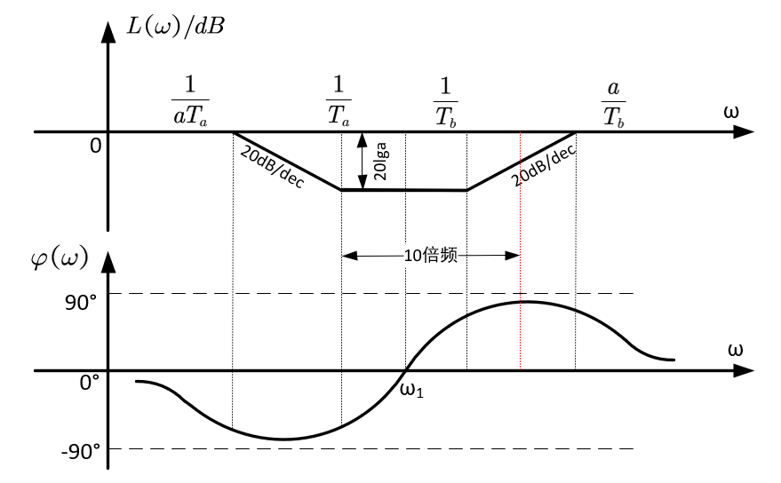 由此便可以得到转折频率以及零极点关系,滞后-超前的对数频率特性如下所示:
