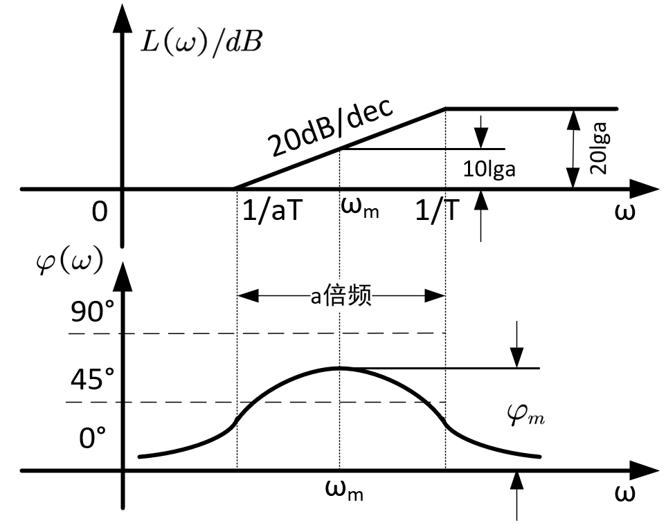 观察它的对数频率特性,超前网络最大能使原系统的幅值抬高20lga dB,且该高度只和转折频率有关。超前网络最大的相角 φ m φ_m φm在两个转折频率的中点处,超前校正就是将这一点处的频率特性补到原系统中,使系统的相角提升 φ m φ_m φm(实际上补不到 φ m φ_m φm,因为校正后的系统由于截止频率后移,相角还会衰减几度。),幅值提升10lga。