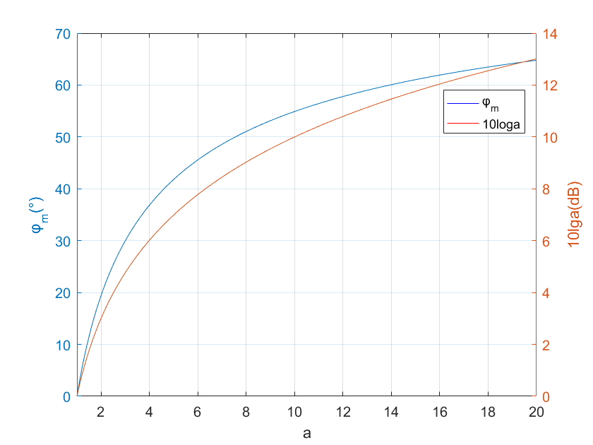 通过这个关系图,就能够看出 a ∈ ( 4 , 10 ) a∈(4,10) a∈(4,10)范围内的超前校正最有效,既能高效抬高系统的相角裕度 γ γ γ,又使得幅值增加不至于过大;而当a=14时, φ m = 60 ° φ_m=60° φm=60°,故一般认为一阶超前网络的最大超前角为60°。