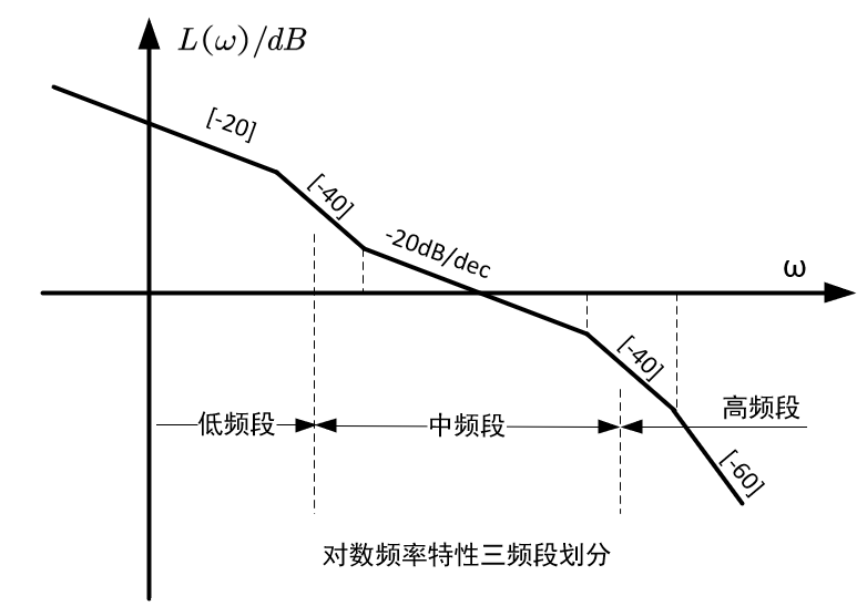 为了更方便地研究对数幅频特性与系统性能指标的关系,通常将 L ( ω ) L(ω) L(ω)人为地分成三个频段:低频段、中频段和高频段,如下图所示: