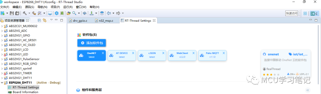 onenet软件包添加方式同ESP8266软件添加一样,这里不再详细介绍。添加成功之后如下图所示,但是注意下,添加成功之后可以看到除了onenet软件包,还多了一些cJSON、WebClient、Paho MQTT,这些都是onenet依赖包,添加onenet软件包时自动添加。