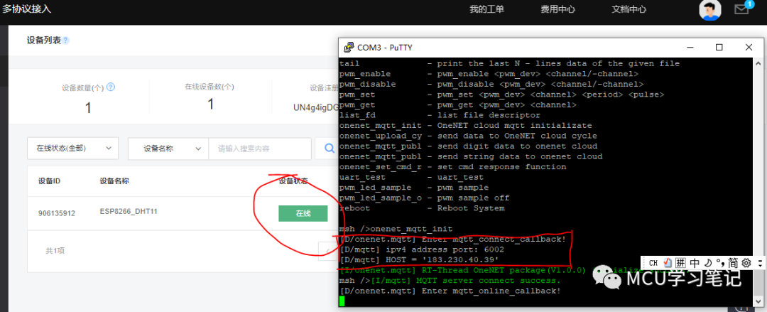 将编译后的bin文件下载到控制板。打开putty终端端。在putty终端下,输入Tab键可以查看得到一些导出的命令,可以看得到有几个onenet开头的相关的命令。首先先调用onenet_mqtt_init初始化函数,初始化成功会有云端返回数据,同时在设备onenet网页设备列表可以看到设备已经接线。也就是终端设备介入了onenet云平台。