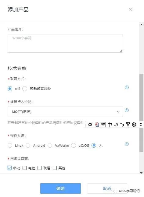 然后,点击添加产品,进入产品配置界面,如下图所示。其中,星号为比填写内容。“产品名称” 和“产品简介” 按自己的要求写即可, “产品行业” 和“产品类型” 自由选择, “联网方式” 选择 wifi, 操作系统选“无” , “接入协议” 这里选 MQTT(旧版)。接着点确定即可完成产品创建。