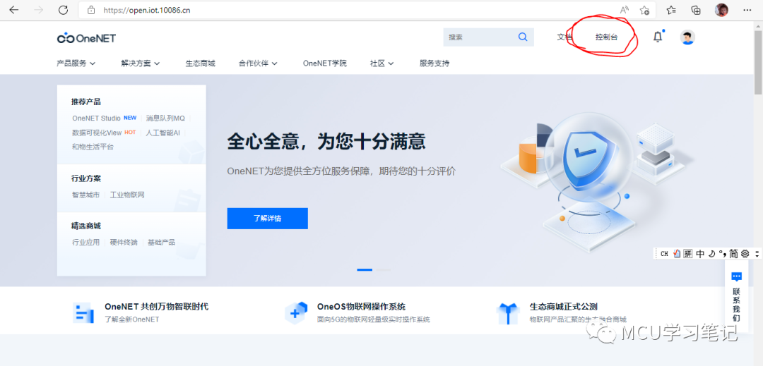 打开onenet云平台网站 https://open.iot.10086.cn/, 右上角有“登录” 和“注册” , 如果没有帐号请先注册, 可以选择个人注册或者企业注册, 注册以后登录。注册最好选择移动手机号注册,收发验证码快。