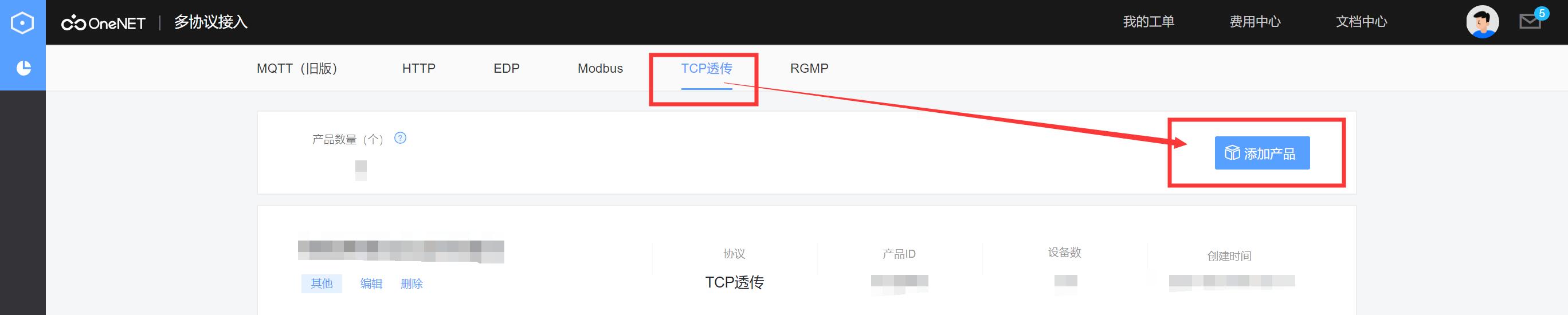 5.点击TCP透传→添加产品