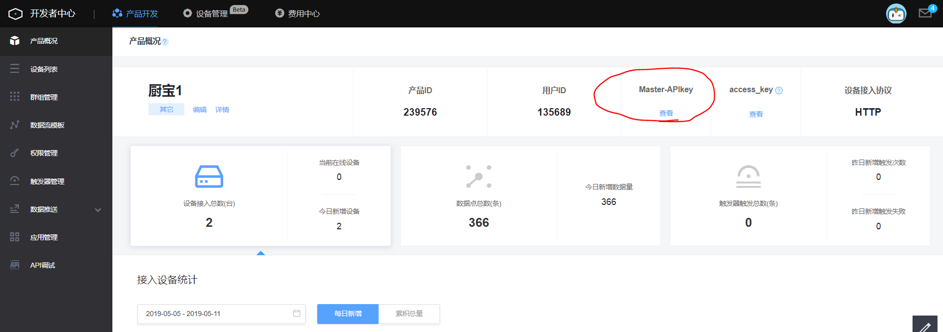 3、点击上一步创建的产品,进入界面如下,记录Mastr-APIkey(后面会用到)