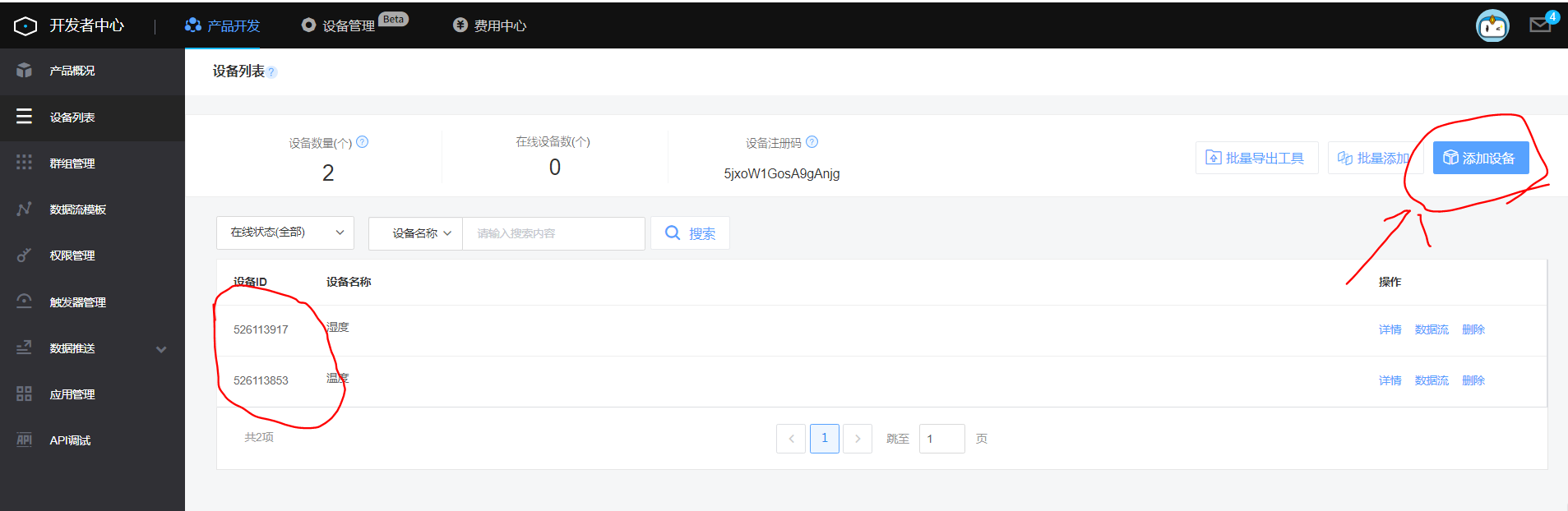 修改成自己的APIKEY和设备ID,上传温度、湿度代码大致相同,不同的设备对应不同的设备ID