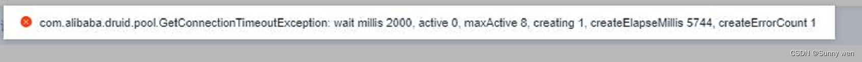 “com.alibaba.druid.pool.GetConnectionTimeoutException: wait milis 2000, active 0, maxActive 8,creating 0, createEmorCount 1”。