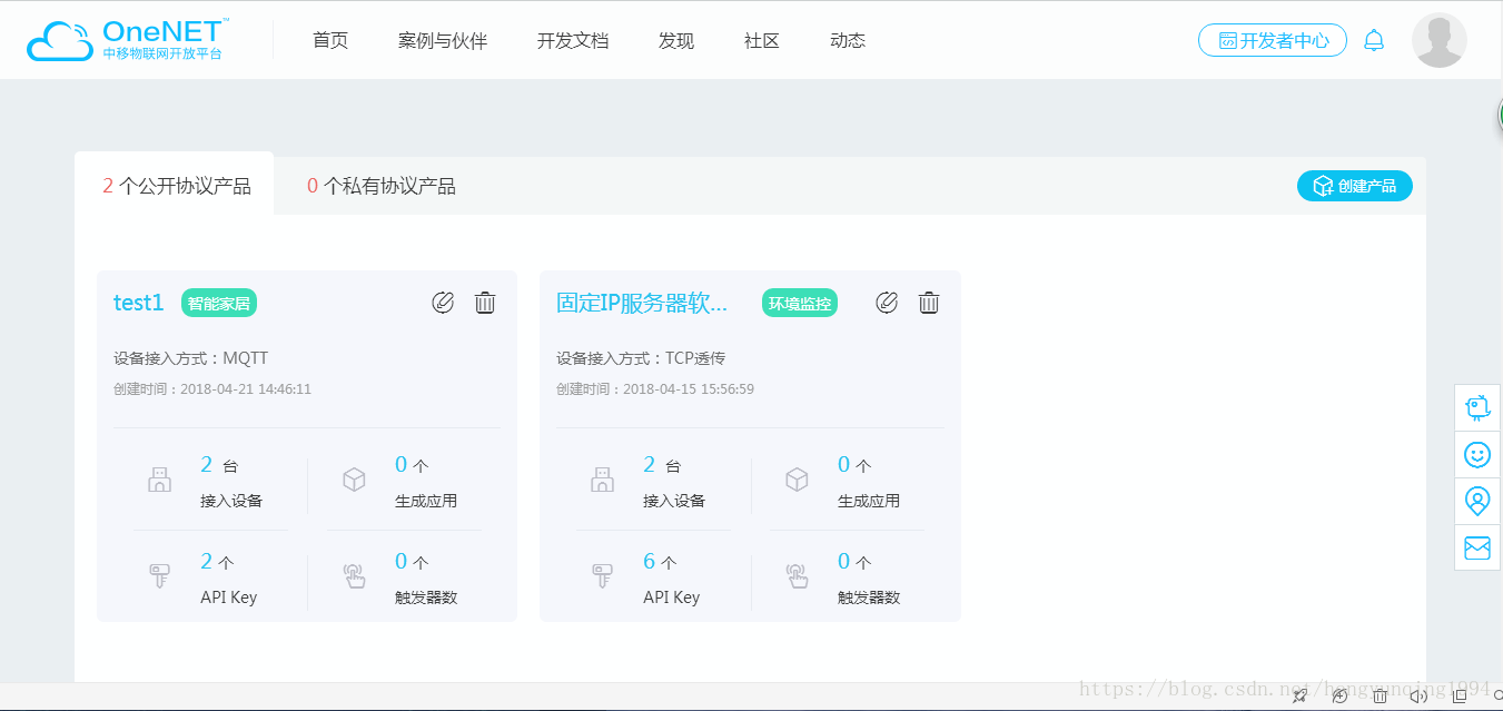 现在我们在云平台上有了自己的产品,类似于有了一个数据上传中心。在开发者中心首页,可以看到自己的产品列表,我这里有 两个产品,用于测试的产品仅仅是test1这个产品,创建的时候我选择的是MQTT协议,这个可以根据需求选择,上文链接中的 文档也有简单介绍。我将会把数据上传到test1产品下面。