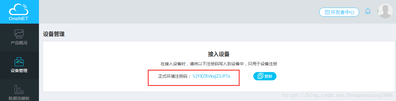 创建产品之后,系统会生成一个产品ID、APIKey和正式环境注册码,正式环境注册码将在后面注册设备的时候用到。
