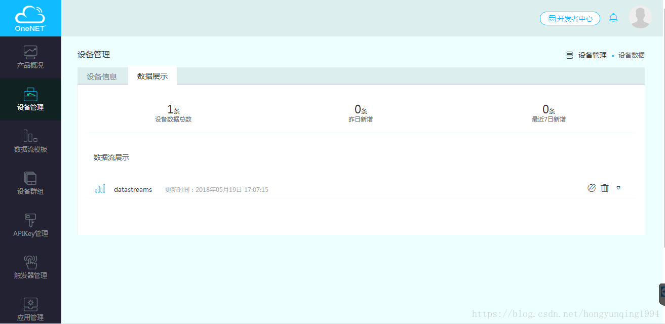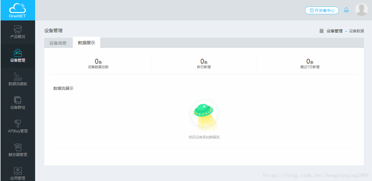 以上,我们以注册的名为LGLK_ZSD1800324的设备为例,系统返回设备ID和APIKey,后续会用到。可以看到,刚注册的设备数据展示还是0,没有传入任何数据: